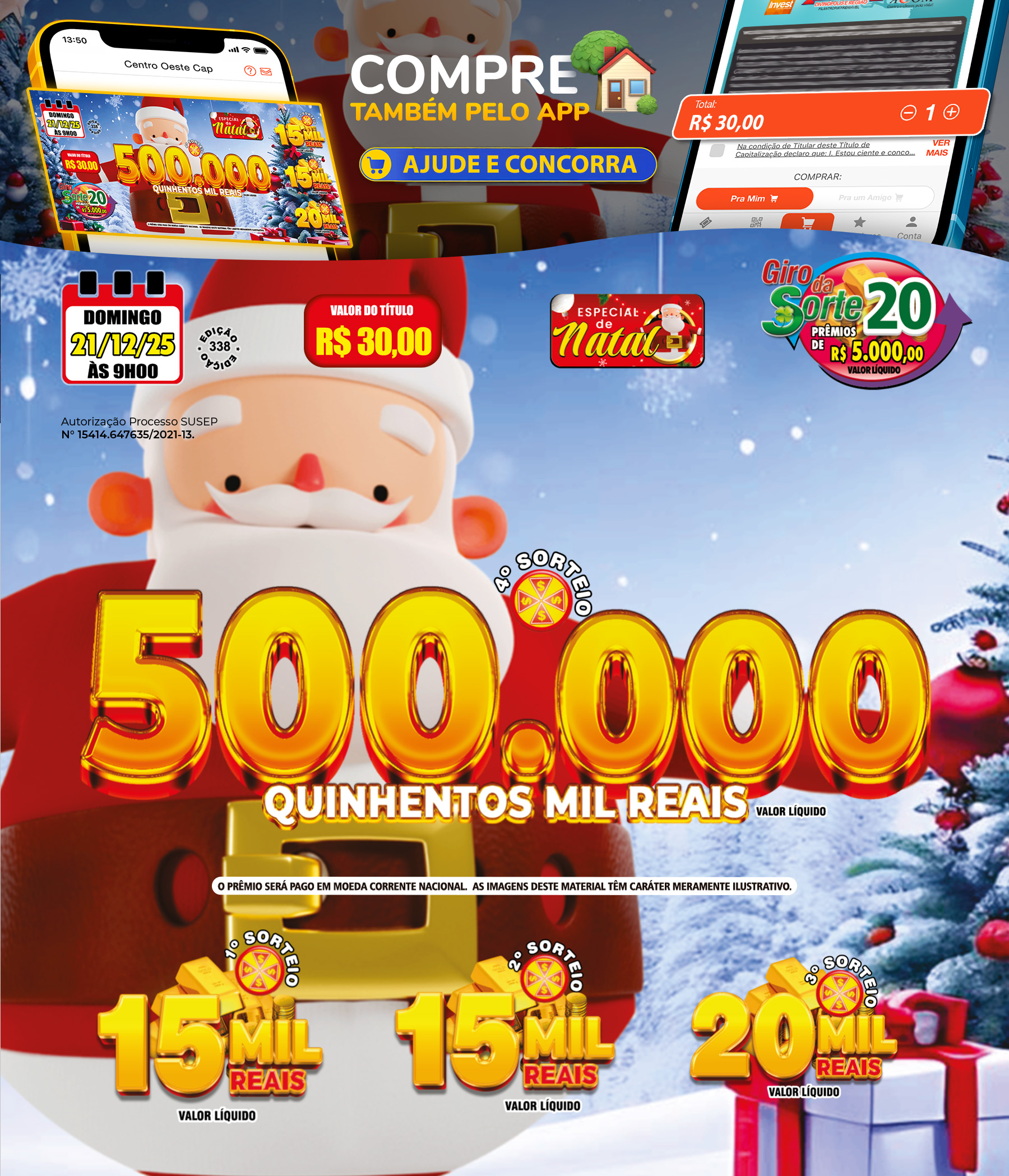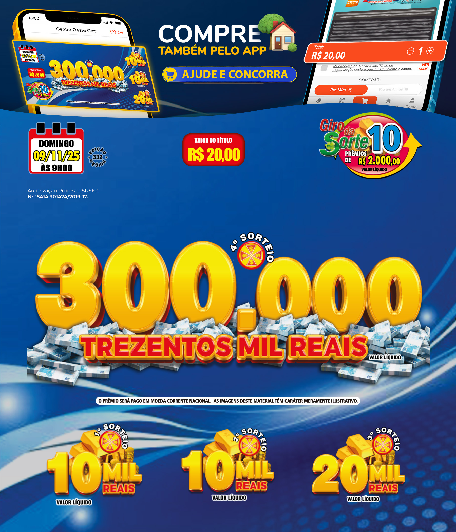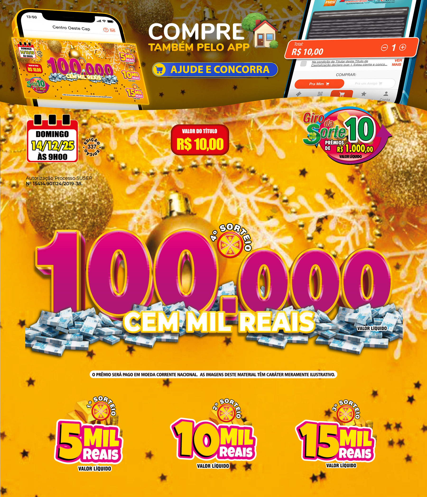 Compre seu título até as 23:59 do sábado sem sair de casa em apenas alguns passos 📲 Além disso, você pode acompanhar ganhadores, novidades e muito mais sobre o CENTRO OESTE CAP! Baixe já 🍀