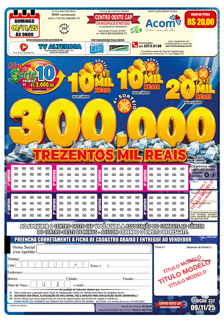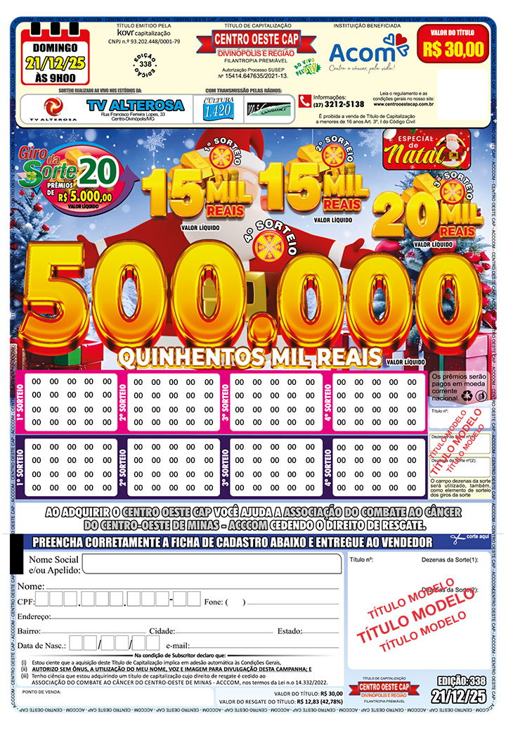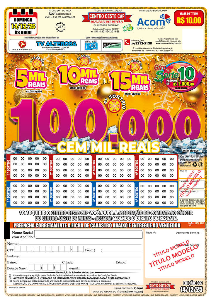 Os sorteios ocorrem ao vivo todos os Domingos, à partir das 09h00, com transmissão pela TV ALTEROSA. E também pelas rádios CULTURA 1420 AM, Rádio 87,9 FM, Rádio NOVA ONDA 91,5 e Rádio Candidés FM 100.5